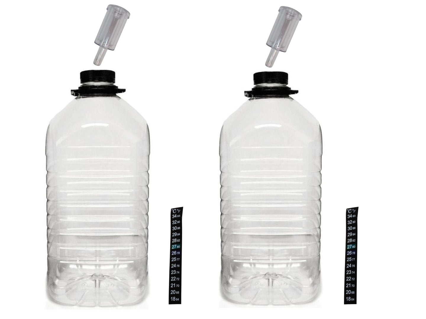 2x 1 imperial gallon / 5 litre PET demijohns with bored caps, grommets, handy airlocks and thermometer strips by Almost Off Grid. PET plastic demijohns are a great alternative to glass. They are lighter and can be reused. These two come complete with pre-bored holes in the caps fitted with grommets. The handy airlocks fit in the grommets creating an airtight seal. The airlocks work one way, so they let air out of your homebrew whilst not allowing contamination or fruit flies in. Handy airlocks do not 'bloop' like bubbler airlocks, they are very quiet. Also included are two lcd temperature indicators in the form of thermometer strips. Perfect for winemaking, or making homebrew cider or mead. 2 demijohns, airlocks and thermometer strips per pack.