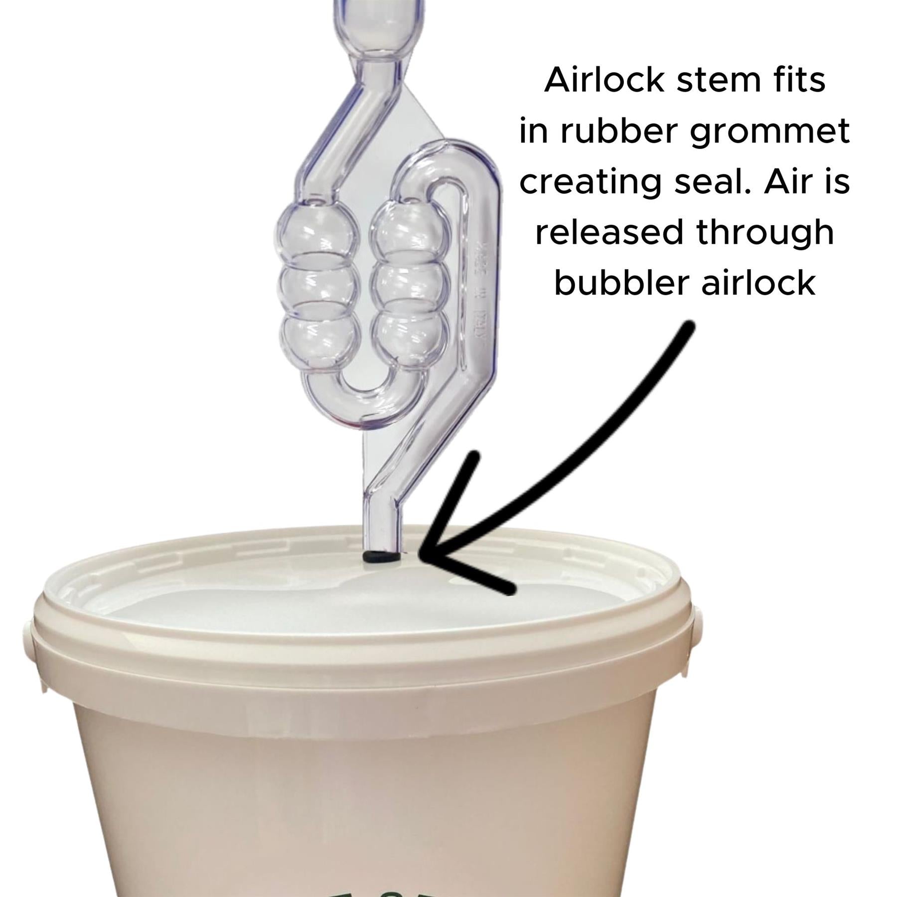 1 tight fitting lid for the bucket with a bored hole, fitted with a pvc grommet to keep an airlock in place